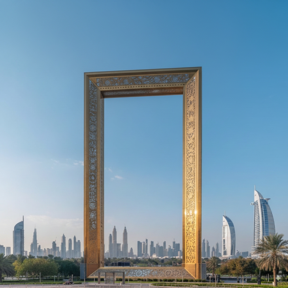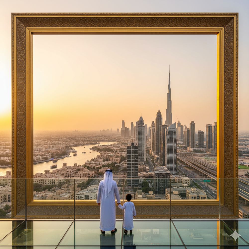 Zayd stood at the base of the Dubai Frame, eyes wide with wonder at the giant golden
