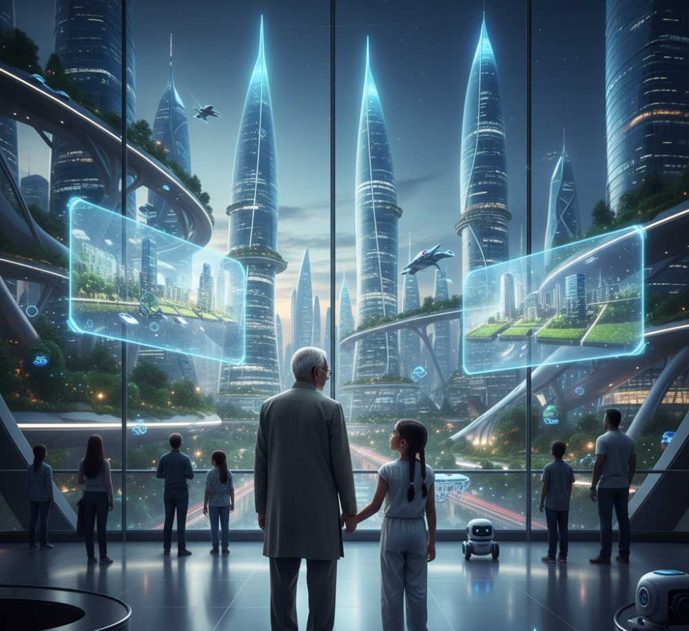 Maya clutched her grandfather’s hand as they approached the Museum of the Future, its sleek,