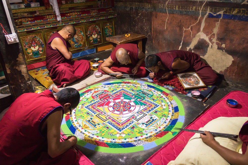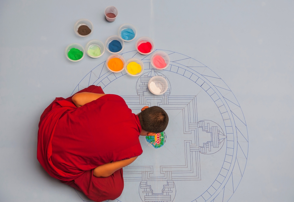In a Tibetan monastery, monks sit together in stillness, devoting their time to the Circle of Impermanence. Their hands move gently, placing coloured grains of sand in delicate patterns. The mandala grows slowly like a universe of prayers, like a symbol of beauty and devotion.
